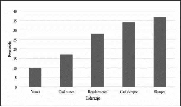 En la variable del liderazgo, la Figura 8 expone la amplia influencia que tiene este sobre los trabajadores. El nivel de confiabilidad de este apartado, según el análisis realizado por el programa SPSS, fue de 0.958. Tuvo una mediana de 51, dato que se encuentra en el rango de "Casi siempre", con límite inferior de 47.6 y superior de 58.8.