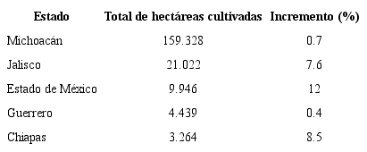 A partir de esta resolución, la producción de aguacate en México se ha incrementado principalmente en los estados de Jalisco, México, Guerrero y Chiapas, aumentándose el número de hectáreas cultivadas con aguacate, como se observa en Tabla 1.