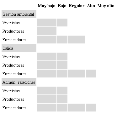 Los resultados ponen en evidencia que viveristas y productores de aguacate tienen un bajo rendimiento en las dimensiones evaluadas, sin embargo, los empacadores muestran una mejor eficiencia, sin duda alguna esto representa un desbalance en la cadena de valor ya que la esencia de toda cadena es generar el mayor nivel de valor para trasladarlo al siguiente eslabón y que al final los productos sean de alto valor agregado.