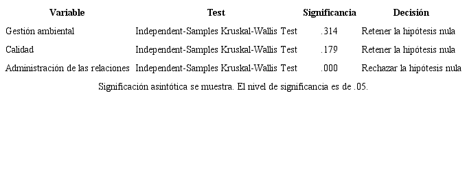 En este apartado se presentan las pruebas que permiten contrastar si dos muestras aleatorias e independientes proceden de una misma población, es decir, si un factor que subdivide la población de origen incide de forma significativa sobre el valor central de la población. Estos contrastes son alternativas no paramétricas al análisis de la varianza cuando se incumple alguno de los supuestos básicos de dicho análisis. El único requisito para aplicar estos contrastes es que la variable esté medida al menos en una escala ordinal. La prueba de hipótesis dio como resultado retener la hipótesis nula en el análisis de las dimensiones: gestión ambiental y calidad; por el contrario, se rechaza la hipótesis nula en la dimensión administración de las relaciones. Por lo tanto, la variable gestión ambiental muestra que su desempeño no es importante para estas empresas ya que dan poca importancia al cuidado del medio ambiente cuando efectúan sus actividades permanentemente. De hecho, existe un constante y creciente cambio del uso de suelo, las plantaciones de pino benéficas para el medio ambiente se están talando de manera irracional para plantar árboles de aguacate, estos últimos altamente nocivos para el medio ambiente, no toman en cuenta la legislación ambiental en sus procesos e insumos y no averiguan si sus proveedores tienen implementado un sistema de gestión ambiental. Con respecto a la variable calidad, se presenta la misma situación, y en lo referente a la administración de relaciones, estas organizaciones sí desempeñan acciones destinadas a mantener unas relaciones a largo plazo ya que de esto depende mucho su supervivencia y permanencia en el mercado norteamericano.