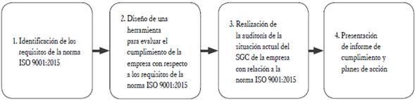 En la primera etapa, inicialmente se identificaron los requisitos o debes de la norma ISO 9001:2015 para un sistema de gestión de la calidad distribuidos en 7 capítulos de los 10 que la conforman. En la segunda etapa se diseñó una herramienta conformada por varias hojas de cálculo, programadas para que en la primera hoja se pudiera seleccionar el estado de cumplimiento de la empresa con respecto a cada requisito de la norma ISO 9001:2015 y en el resto de hojas se arrojaran gráficamente los resultados. Posteriormente se desarrolló la tercera etapa que consistió en la ejecución de una auditoría de la situación actual del SGC de la empresa objeto de estudio con respecto a los requisitos de la norma ISO 9001:2015. Esta auditoría fue realizada mediante la revisión de la información aportada por los directivos de la empresa, la realización de visitas a las oficinas de esta y entrevistas con el personal líder de los diferentes procesos.