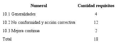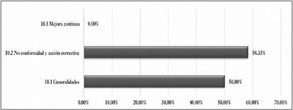 En la Figura 10 se evidencia que los numerales 10.1 y 10.2 tienen un cumplimiento parcial, mientras que el numeral 10.3 presenta un incumplimiento total; por lo tanto el plan de acción propuesto para el capítulo 4 de la norma contempla las siguientes actividades: a) elaborar un formato para reporte de acciones de mejora, b) elaborar un procedimiento para la toma de acciones de mejora, c) elaborar un formato para reporte de no conformidad y acciones correctivas, d) elaborar un procedimiento para la toma de acciones correctivas, e) documentar un procedimiento para la realización de comités de calidad y, f) elaborar un formato para reporte de acciones de mejora.
