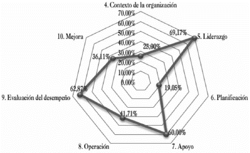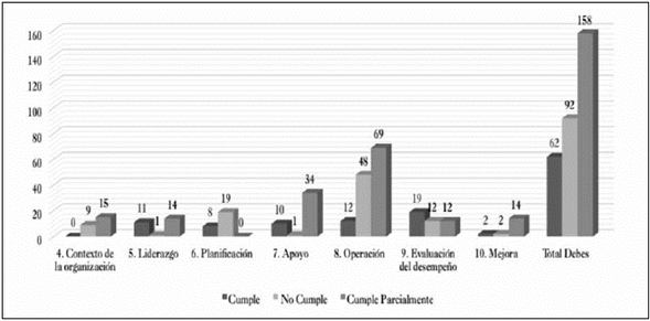El análisis del cumplimiento por capítulo de la norma permitió observar que el capítulo 5 de Liderazgo fue el que tuvo un porcentaje más alto, que aunque se encuentra dentro del rango de cumplimiento parcial, denota que existe un compromiso significativo por parte de la dirección de la empresa con respecto al sistema de gestión de la calidad; por otra parte el capítulo 6 de Planificación fue el que tuvo el porcentaje de cumplimiento más bajo, causado principalmente para la ausencia de una planificación de cambios y de una metodología para abordar riesgos y oportunidades. El cumplimiento promedio de todos los capítulos de la norma tuvo un resultado del 44.84 %, que se encuentra dentro del rango de incumplimiento de los requisitos e indica que la empresa aún tiene muchos aspectos por diseñar, implementar y reforzar.