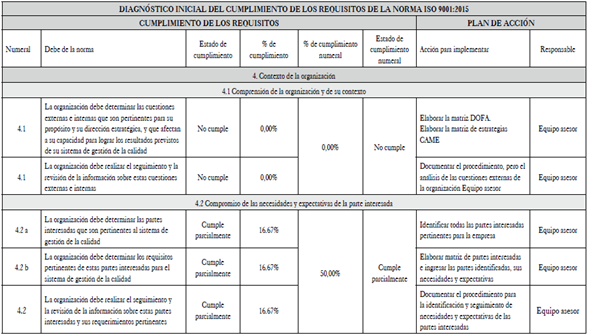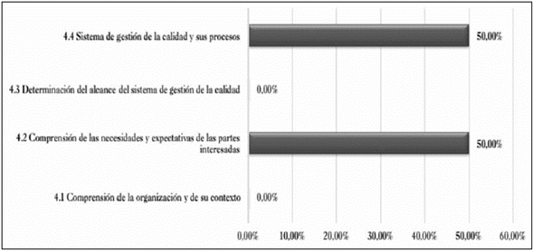 En la Figura 4 se evidencia que los numerales 4.2 y 4.4 tienen un cumplimiento parcial, mientras que en los numerales 4.1 y 4.3 se presenta un incumplimiento total; por lo tanto el plan de acción propuesto para el capítulo 4 de la norma contempla las siguientes actividades: a) elaborar un análisis DOFA (debilidades, oportunidades, fortalezas y amenazas), b) documentar el procedimiento para el análisis de las cuestiones externas de la organización, c) identificar todas las partes interesadas pertinentes para la empresa, d) elaborar una matriz de partes interesadas e ingresar las partes identificadas y sus necesidades y expectativas, e) documentar el procedimiento para la identificación y seguimiento de necesidades y expectativas de partes interesadas, f) documentar el alcance del SGC de la empresa de acuerdo con los requisitos de la norma ISO 9001:2015, g) identificar todos los procesos involucrados en las operaciones de la empresa, h) actualizar el mapa de procesos vigente en la empresa de acuerdo con las necesidades evidenciadas e, i) actualizar las caracterizaciones de los procesos establecidos en el mapa de procesos de acuerdo con los requisitos de este numeral.