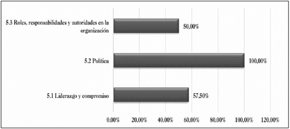 En la Figura 5 se evidencia el numeral 5.2, que tuvo un cumplimiento total, mientras que los numerales 5.1 y 5.3 presentaron un cumplimiento parcial; por lo tanto, el plan de acción propuesto para el capítulo 5 de la norma contempla las siguientes actividades: a) documentar procedimiento para la rendición de cuentas del SGC, b) elaborar una matriz de rendición de cuentas, c) capacitar a la alta dirección acerca de la gestión del riesgo de procesos, d) realizar sensibilización al personal de la empresa acerca del proyecto de transición del SGC a la norma ISO 9001:2015, e) diseñar una matriz de requisitos legales, f) diseñar una matriz de riesgos, g) establecer un indicador de gestión que mida el aumento de la satisfacción del cliente, h) actualizar los perfiles de cargos e, i) diseñar una matriz de roles, responsabilidades y autoridades del SGC.