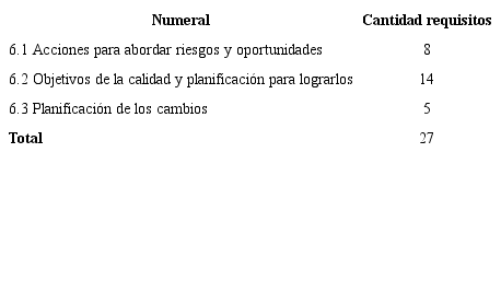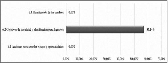 En la Figura 6 se evidencia que los numerales 6.1 y 6.3 presentan un incumplimiento total, mientras que el numeral 6.2 presenta un cumplimiento parcial; por lo tanto el plan de acción propuesto para el capítulo 6 de la norma contempla las siguientes actividades: a) diseñar una matriz de riesgos, b) documentar procedimiento para la gestión del riesgo, c) documentar un procedimiento para la gestión de las oportunidades, d) elaborar un formato para reporte de acciones para abordar riesgos y oportunidades, e) actualizar los objetivos de la calidad, f) documentar despliegue de los objetivos de la calidad, g) documentar procedimiento para la gestión de los cambios, h) elaborar un formato para gestión del cambio e, i) elaborar una matriz para gestión de cambios.