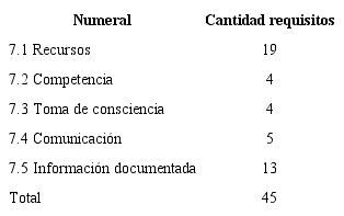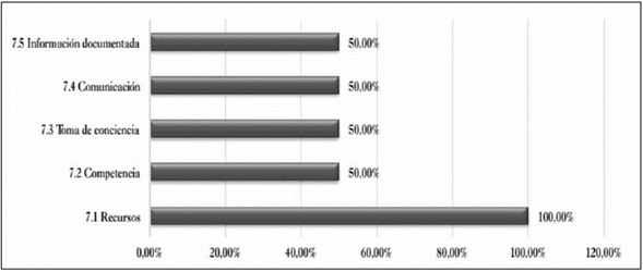 En la Figura 7 se evidencia que el numeral 7.1 presentó un cumplimiento total y los numerales del 7.2 al 7.5 presentaron un cumplimiento parcial; por lo tanto el plan de acción propuesto para el capítulo 7 de la norma contempla las siguientes actividades: a) elaborar listado de equipos de medición de la empresa, b) elaborar programa de calibración de equipos de medición, c) documentar procedimiento para la calibración de equipos de medición, d) elaborar una matriz de identificación de los conocimientos, e) documentar un procedimiento para la gestión del conocimiento, f) documentar un procedimiento para la selección del personal, g) documentar un procedimiento para la evaluación del desempeño del personal, h) realizar charlas, sensibilizaciones y capacitaciones para la toma de consciencia del personal que impacta en el SGC, i) documentar matriz de comunicaciones, j) elaborar listado de requisitos de documentación de la ISO 9001:2015 (mantener y conservar) y, k) elaborar un procedimiento para el control de la información documentada.