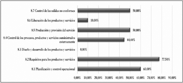 En la Figura 8 se evidencia que el numeral con mayor porcentaje de cumplimiento fue el 8.2 y los numerales con menor cumplimiento fueron el 8.3 y el 8.6; por lo tanto el plan de acción propuesto para el capítulo 8 de la norma contempla las siguientes actividades: a) documentar caracterización del proceso de producción, b) documentar plan de control de calidad de producción, c) documentar procedimiento para la gestión de los cambios, d) documentar procedimiento para la gestión de pedidos e incluir los requisitos de este numeral, e) elaborar un formato para lista de chequeo de pedido de cliente, f) implementar una lista de chequeo de revisión de pedido de cliente, g) establecer un proceso de diseño y desarrollo, h) documentar la caracterización del proceso de diseño y desarrollo, i) documentar procedimiento para gestionar el diseño y desarrollo de productos, j) documentar procedimiento de inspección de recibo de materias primas, k) elaborar unos formatos de inspección de materias primas, l) documentar procedimiento de auditorías a proveedores externos, m) documentar procedimiento para el control de procesos suministrados externamente, n) actualizar el procedimiento para la selección, evaluación y reevaluación de proveedores externos, ñ) actualizar formato para evaluación y reevaluación de proveedores externos, o) incluir los procesos suministrados externamente dentro del mapa de procesos, p) establecer indicadores de gestión que permitan hacer seguimiento al rendimiento de los proveedores externos, q) documentar procedimiento auditorías a proveedores externos, r) socializar a los proveedores externos los procedimientos de: inspección de recibo de materias primas y auditorías a proveedores externos, s) documentar caracterización del proceso de producción, t) documentar plan de control de calidad de producción, u) actualizar fichas de especificaciones técnicas, v) documentar procedimiento para la identificación y trazabilidad de los productos, w) documentar procedimiento para el control de la propiedad del cliente o de proveedores externo, x) documentar el procedimiento de servicio posventa, y) incluir las actividades de servicio posventa dentro de la caracterización del proceso de servicio al cliente, z) documentar procedimiento para el tratamiento de peticiones, quejas y reclamos, aa) elaborar un formato para reporte de petición, queja o reclamo, bb) establecer proceso de control de calidad, cc) elaborar plan de control de calidad de producción, dd) documentar procedimiento para inspecciones de calidad, ee) elaborar unos formatos para registro de inspección de calidad, ff) documentar procedimiento para el control de las salidas no conformes y, gg) elaborar un formato para el reporte y tratamiento de salida no conforme.