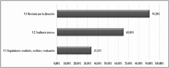 En la Figura 9 se evidencia que el numeral 9.3 tiene un cumplimiento alto, el numeral 9.2 tiene un cumplimiento parcial y el numeral 9.1 presenta un incumplimiento; por lo tanto el plan de acción propuesto para el capítulo 9 de la norma contempla las siguientes actividades: a) elaborar una matriz de seguimiento a indicadores de gestión, b) elaborar un formato para el reporte de informes de gestión por proceso, c) documentar procedimiento para la realización de encuestas de satisfacción del cliente, d) elaborar un formato para encuestas de satisfacción del cliente, e) elaborar un formato para el reporte de informes de gestión por proceso, f) actualizar procedimiento para la realización de auditorías internas de calidad, g) actualizar el procedimiento para la revisión por la dirección, incluyendo en las entradas las cuestiones externas e internas y la revisión de riesgos y, h) actualizar el formato de acta de revisión por la dirección.