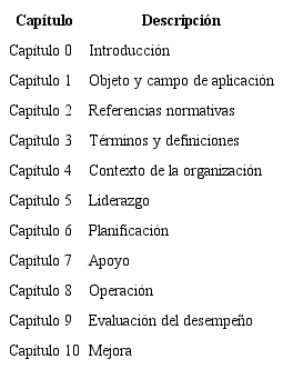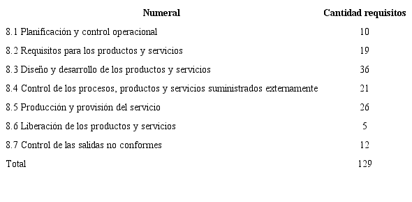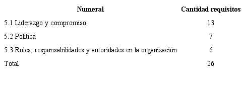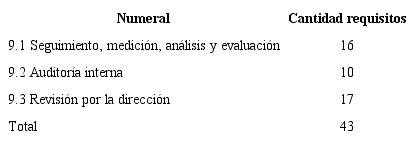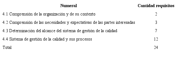 En la Tabla 1 se pueden observar los 10 capítulos que conforman la norma ISO 9001:2015; se identificó que los capítulos del 0 al 3 no contienen requisitos, mientras que los capítulos del 4 al 10 establecen los requisitos o debes de obligatorio cumplimiento para un sistema de gestión de la calidad. Se identificaron en total 312 requisitos o debes en la norma, los cuales se encuentran distribuidos en numerales dentro de los capítulos mencionados anteriormente, tal como se presentan en las Tablas 2, 3, 4, 5, 6, 7 y 8.