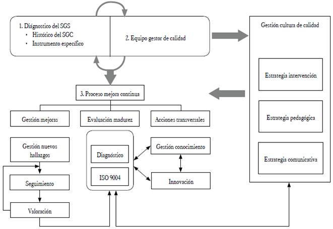 La propuesta para gestionar el sistema de gestión de calidad está dividida en partes que incluyen un diagnóstico a través de fuentes idóneas, conformación del equipo gestor de calidad, procedimientos y la forma de realización de las tareas, la evaluación de la madurez y el planteamiento de acciones sobre elementos transversales (gestión del conocimiento, e innovación, entre otros aspectos).