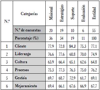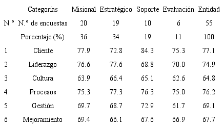 Los resultados de la encuesta señalan que las categorías de mejoramiento son las validas y se deben trabajar para que aporten al desempeño, en especial en lo que tiene que ver con los temas de cultura y gestión.