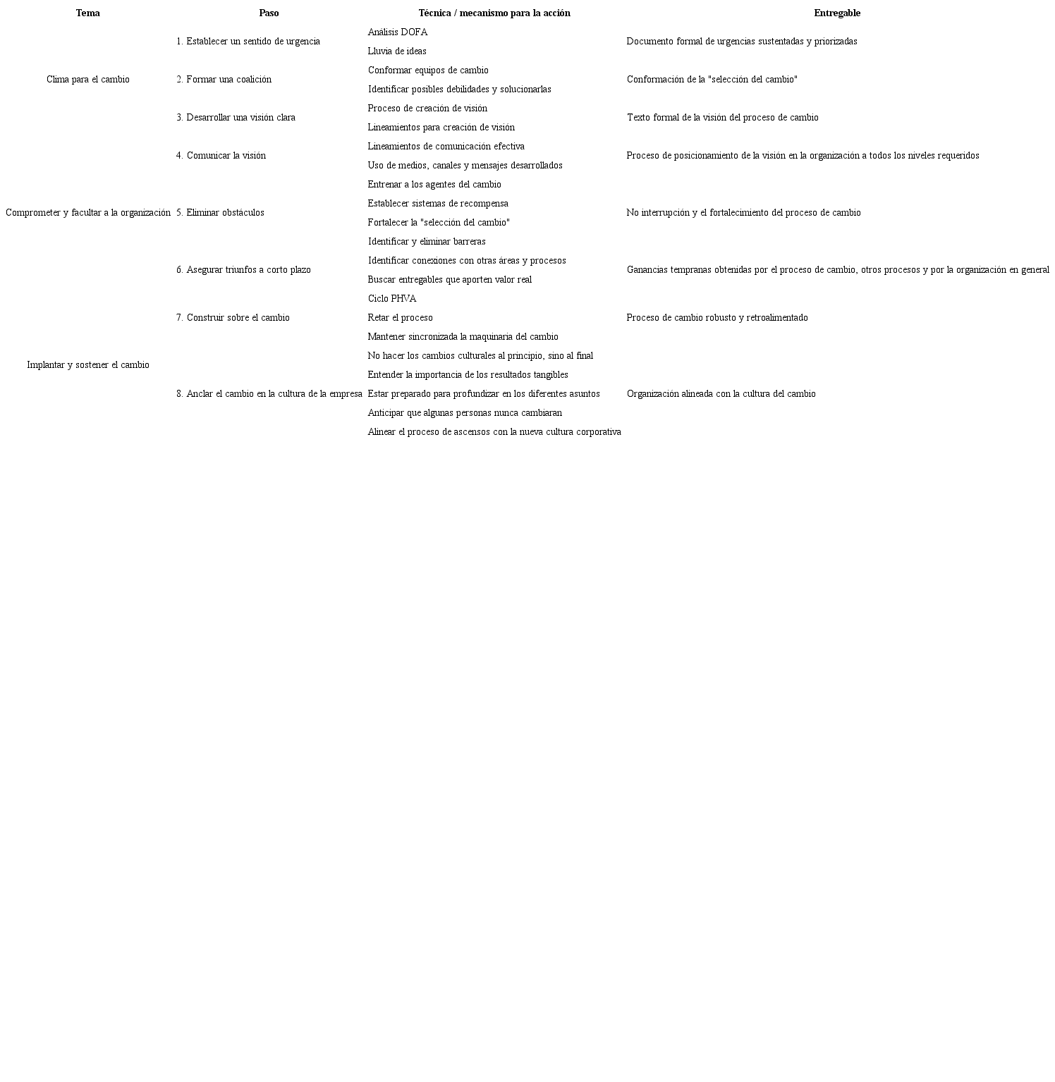 La estrategia de intervención: un buen referente para ayudar al cambio en pro de la calidad es el propuesto por John Kotter, quien indica que existen ocho pasos que todo proceso de cambio debería seguir (Tabla 1).