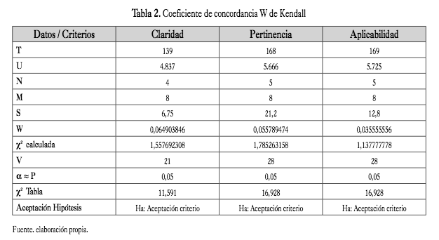 La concordancia entre los ítems de cada uno de los criterios establecidos (claridad, pertinencia y aplicabilidad) se establece mediante el coeficiente de Kendall, para lo cual es necesario conocer la cantidad de repeticiones que existen en cada una de las respuestas; en otras palabras, se establece la frecuencia de cada nivel de respuesta por ítem, consolidado dentro de cada categoría obteniendo un X2 que debe ser comparado con un X2 obtenido mediante la tabla de chi-cuadrado, con el fin de aceptar cada uno de los criterios (si el X2 calculado es menor al X2 de la tabla, entonces es aceptado el criterio), para cuyo caso se utilizará un margen de confianza del 95%. Los resultados se evidencian en la tabla 1.