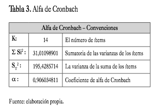 De igual manera se realiza el cálculo del alpha de Cronbach (tabla 2), cuyo resultado es de un valor de 0,9060, lo que indica una alta fiabilidad en la escala usada y determina que existe una independencia fuerte entre los 14 ítems evaluados.
