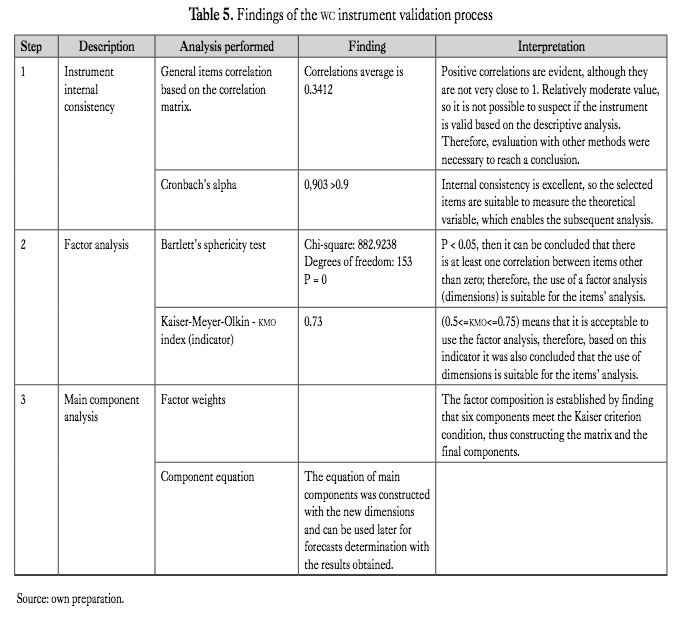 Factor analysis: since based on the theoretical knowl- edge defined dimensions are supposed to be correct, it is necessary to corroborate whether the use of factors or di- mensions is appropriate due to the variability (variance) shown by the different items within an instrument. It is necessary to clarify that the use of factors has proven to be adequate. However, it is not proven whether the fac- tors chosen are suitable, since this would imply the use of a confirmatory factor analysis that has not been con- sidered in this research. The previous verification can be conducted based on some indicators and statistical tests. Two tools were used, namely: 1. Bartlett’s sphericity coefficient, 2. Kaiser-Meyer-Olkin - kmo index.