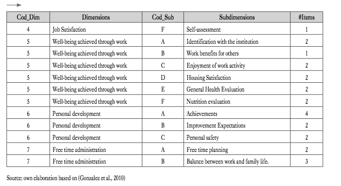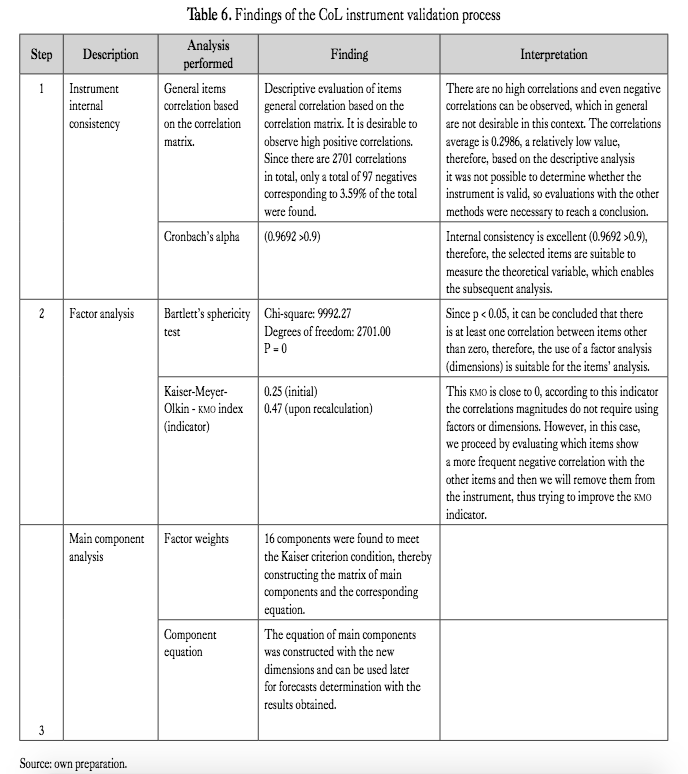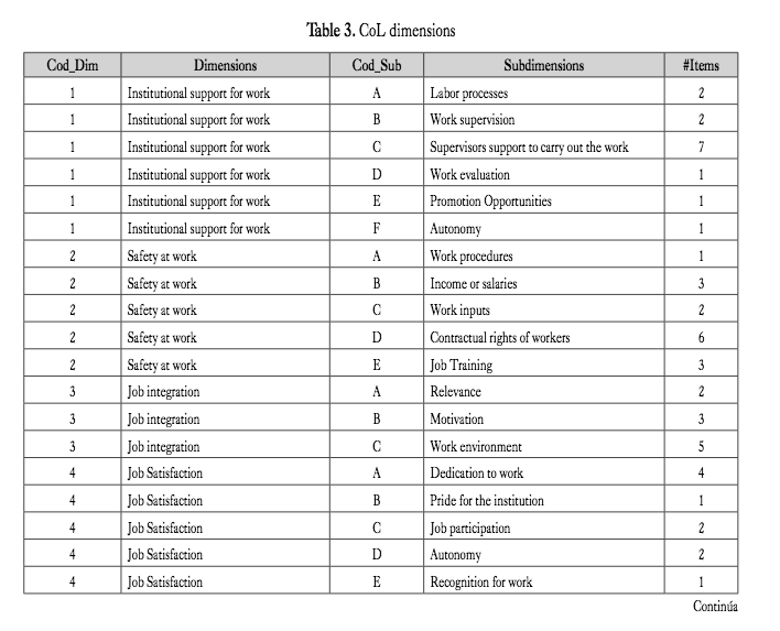 CoL: The instrument is composed of 74 items that seek to measure the theoretical dimension (ml of os- has). These 74 items have been measured with the same scale, so for its analysis data standardization was not necessary. These items were classified in 7 dimensions according to their purpose: