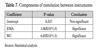 Where the intercept proved to have no statistical signif- icance, on the other hand, the regression coefficients for ema and wc proved to be statistically significant at a 95% confidence. The criterion used is the p-value, where p < 0.05 indicates statistical significance of the regression coefficient. The reported p-values are shown in Table 7: