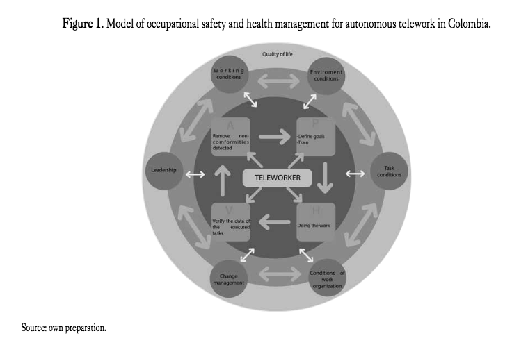 he occupational health and safety management model for autonomous teleworkers was developed. Such model has different categories directly related to the teleworker, and the purpose is to manage osh from the promotion and prevention perspective for teleworkers.