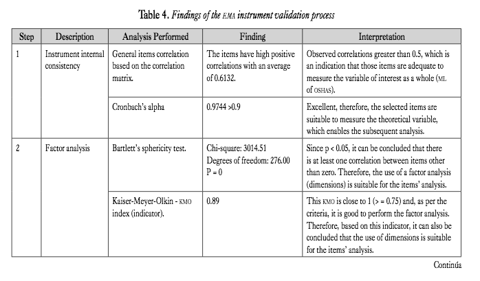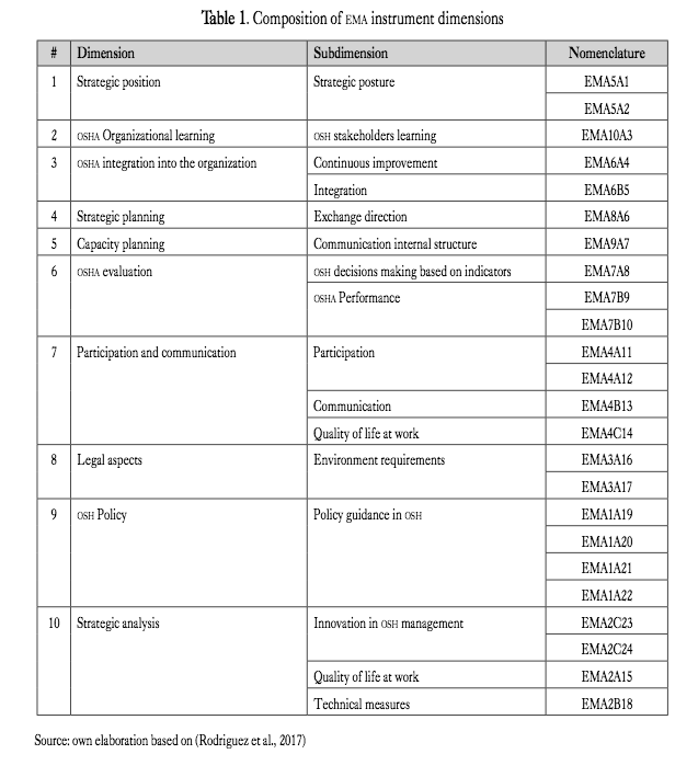 ema: The instrument is composed of 24 items that seek to measure the theoretical dimension of Level of “Maturity of the Occupational Health and Safety Management System” (ml of oshas). The 24 items are classified in 10 dimensions with the same scale so for their analysis data standardization was not necessary.