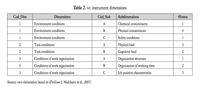 To structure the model, three instruments were ana- lyzed: oshas (ema) maturity scale, working conditions (wc) and Quality of Life (CoL):