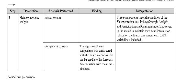 Main component analysis: It was performed to define each item’s weight or weighting and each dimension by explaining the total variability of the osh maturity level. The main objective of the main components analysis is the reduction of dimensionality, i.e., a large set of vari- ables (items) needs to be reduced to a smaller number with the minimum loss of information. That is, explain variability with a smaller number of variables. These new variables are artificial (called main components) and are formed as a linear combination of the original variables. Therefore, the magnitude (absolute value) of the con- stants associated with each original variable in the linear combination can be interpreted as the importance of that original variable to explain the total variability, taking into account that all the items have the same scale of measure.