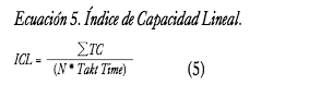 Índice de capacidad lineal (icl): muestra la capacidad de la línea actual con la capacidad requerida (expuesta por el Takt Time y los puestos de trabajo). Si este es inferior al 100%, se interpreta como exceso de trabajo; por el contrario, un valor por encima del 100% determina la falta de trabajo, y es igual a: