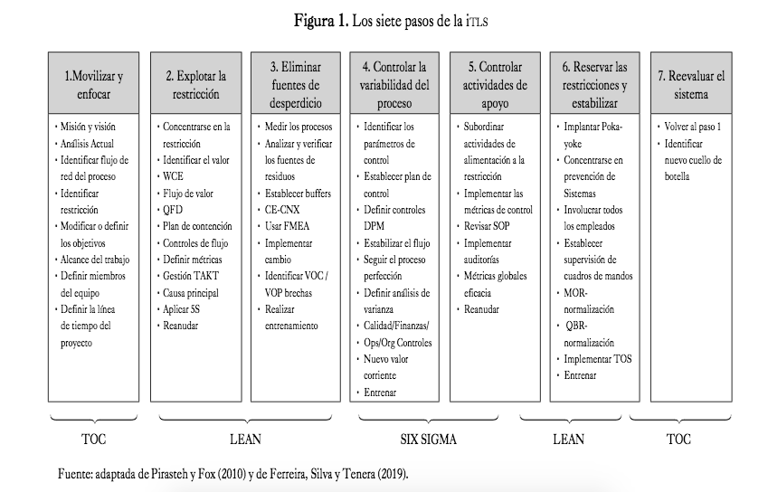De esta premisa nace el itls, un enfoque que integra tres metodologías poderosas relacionadas entre sí: la teoría de las restricciones, Lean Manufacturing y Six Sigma, tomando lo esencial de cada una de ellas e integrándolas de manera completa en busca de la mejora continua. Este modelo fue propuesto por Pirasteh y Fox (2010) en su libro Profitability with no boundaries, donde plantearon y aplicaron por primera vez el modelo más exitoso que integra estos enfoques, dejando en evidencia las bondades que ofrece su unificación y convirtiéndose en pioneros de las aplicaciones que en relación con este se han dado. La figura 1 presenta los pasos completos propuestos por los autores y los relaciona con cada uno de los enfoques compuestos dentro de ella.
