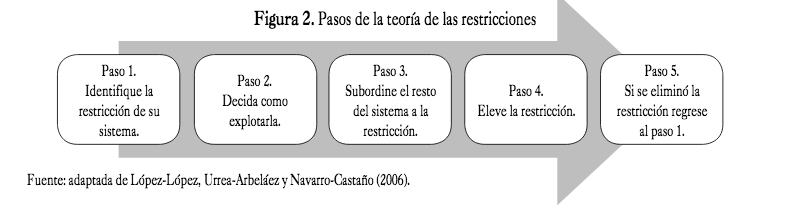 La teoría de las restricciones es un enfoque que permite la gestión de los procesos productivos de las empresas, ayudando a buscar soluciones de problemas críticos relacionados con procesos de producción, decisiones organizativas y problemáticas que representan una limitación. Fue desarrollada en la década de 1980 por el físico Eliyahu M. Goldratt, y ha sido aplicada en todo tipo de empresas, demostrando su utilidad en diferentes áreas. Goldratt y Cox (2005) plantearon que la meta de toda empresa es generar ganancias y la consecución de este objetivo se limita por la restricción del sistema, que debe gestionarse en cinco pasos que pueden evidenciarse en la figura 2.