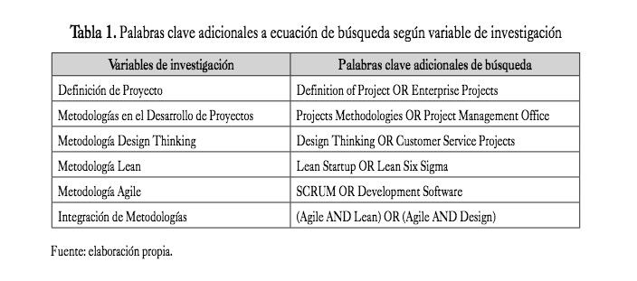 Se definen seis (6) variables de investigación: 1) defi- nición de proyecto, 2) metodologías en el desarrollo de proyectos, 3) metodología Design Thinking, 4) metodo- logía Agile, 5) metodología Lean y 6) integración entre metodologías (tabla 1). En conjunto, con base en estas seis variables y la ecuación de búsqueda creada a partir de los criterios definidos, se indaga en cada una de las bases de datos seleccionadas.