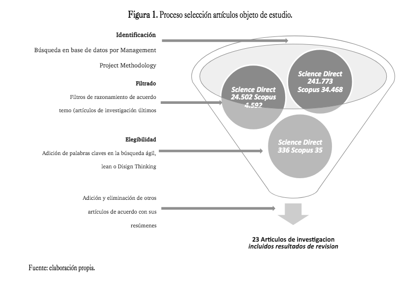 Uno de los criterios para la obtención de una muestra razonable que contribuya al cumplimiento del objetivo de este estudio fue la integración de las siguientes pala- bras clave: Project Management Office, Agile, Lean y Design Thinking, como complemento a la búsqueda principal relacionada con el término en inglés Management Project Methodology. Posteriormente, se realizó la aplicación de filtros de razonabilidad, principalmente de un tipo de documento: artículos de investigación, y se realizó la ex- clusión de artículos muy específicos en cuanto a casos de estudio orientados a manufactura y ciencias de la salud.