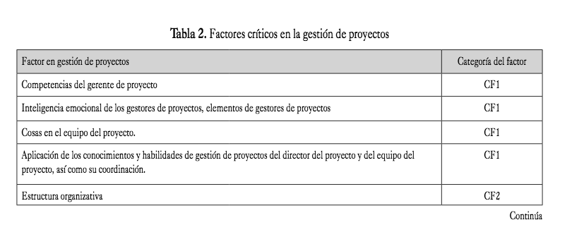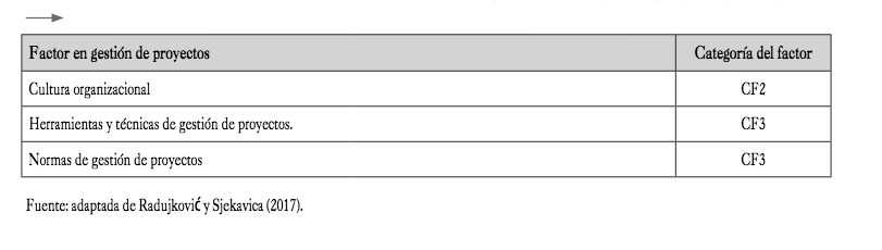 Un breve análisis de estos factores los puede resumir en tres categorías que toda gestión de proyectos debe tener en cuenta, como se destaca en la segunda columna de la tabla 2: Competencias para gestión de proyectos (CF1), Elementos de la organización (CF2) y Elementos de metodo- logías de gestión de proyectos, métodos, herramientas y técnicas (CF3) (Radujković & Sjekavica, 2017).