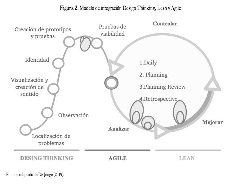 Lean y Design Thinking, cada una independiente- mente, se han integrado con Agile; por ejemplo, en el uso de un enfoque Design Thinking que promueve la comunicación entre los equipos ágiles de desarrollo de software y los clientes a lo largo de todo el proyecto de desarrollo del producto (Pereira & Russo, 2018). Sin embargo, no se ha encontrado dentro de la literatura re- visada la integración de Lean, Design Thinking y Agile para un mismo propósito.