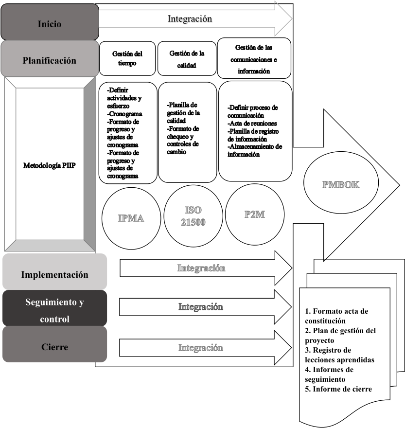 De acuerdo con este modelo, se intervienen cuatro áreas fundamentales (gestión de la integración, gestión del tiempo, gestión de la calidad y gestión de las comunicaciones e información). Con la primera se integran los cinco procesos (inicio, planificación, implementación, seguimiento y control, cierre) durante el desarrollo de la implementación. Aunque con una sola guía como el PMBOK se lograba abordar todas las áreas, se eligieron cada una de las herramientas por sus criterios de autenticidad y sencillez para aplicar en los procesos a intervenir. Se incorporaron los aportes valiosos de PMBOK (Project Management Institute, 2017), International Project Management Association (2015), ISO 21500 y P2M.