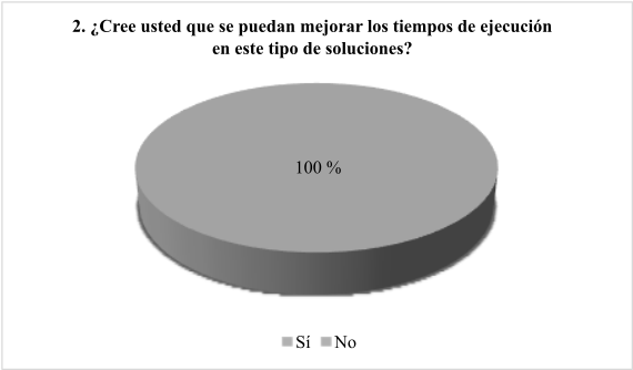 Por su parte, en la pregunta 2 (figura 2), el 100 % de los encuestados indica que se pueden mejorar los tiempos de ejecución de los sistemas distribuidos de antenas. El personal técnico afirma que se pueden optimizar los tiempos, lo que señala una alta probabilidad de evaluar y aplicar procesos que permitan reducir los tiempos.