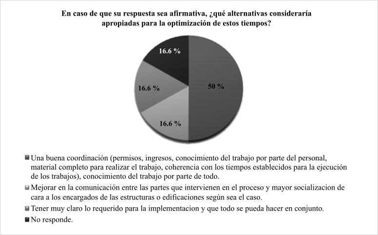 Para complementar esta pregunta, se solicitó que, en caso de que la respuesta fuera afirmativa, el encuestado indicara cuáles alternativas consideraría apropiadas para la optimización de estos tiempos, como se muestra en la figura 3. De acuerdo con las respuestas a esta pregunta, se obtuvieron las siguientes alternativas: