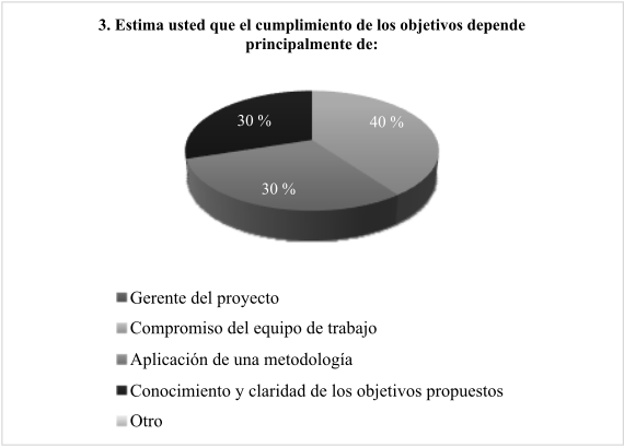 La figura 4 muestra los hallazgos de la pregunta 3. El 60 % de los encuestados indica que el cumplimiento de los objetivos depende principalmente de la aplicación de una metodología y el conocimiento de los objetivos propuestos, mientras el 40 % indica que el cumplimiento de los objetivos obedece al compromiso del equipo de trabajo.
