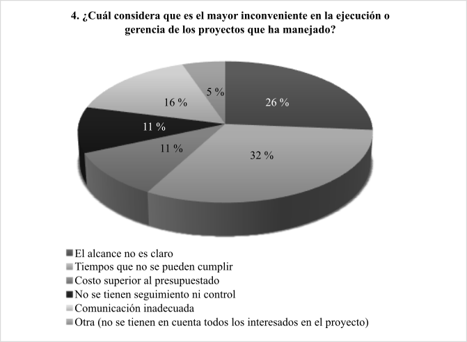 La siguiente pregunta se detalla en la figura 5. El 32 % de los encuestados indica que el mayor inconveniente en la ejecución de los proyectos es cumplir con el tiempo asignado, para el 26 % consiste en no tener claro el alcance, para el 16 % el proceso de comunicación es inadecuado, para un 11 % el problema es el costo del proyecto, que termina siendo superior al presupuestado, y para otro 11 % es la carencia de un adecuado seguimiento y control. El 5 % restante dice que no se tienen en cuenta todos los interesados del proyecto.