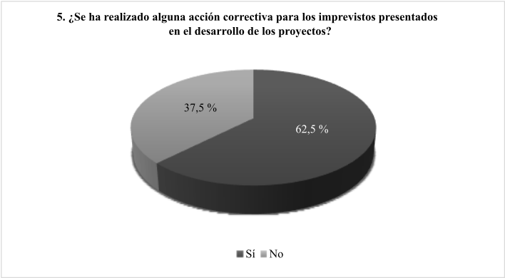 La figura 6 muestra los resultados de la pregunta 5. El 62.5 % de los encuestados señala que se ha realizado una acción correctiva para los imprevistos que se presentan en el desarrollo de los proyectos; el 37.5 % restante dice que no ha realizado ninguna acción correctiva. Para las respuestas afirmativas, se consideraron las siguientes alternativas: crear listas de chequeo para control documental y de seguimiento; validar actividades finalizadas para incluir más personal en lo que resta del proyecto; realizar modificaciones en el producto para cumplir con tiempos y costos; tener más control sobre los colaboradores o aliados que ejecutan los proyectos; buscar una nueva solución para cumplir con el proyecto; dejar plasmadas en el cronograma todas las actividades relacionadas con la comunicación y el buen funcionamiento cuando el sistema debe comunicarse con un aplicativo externo.