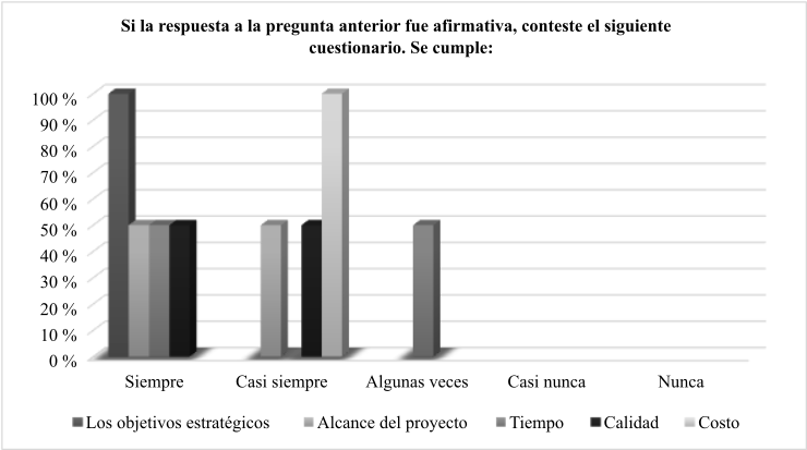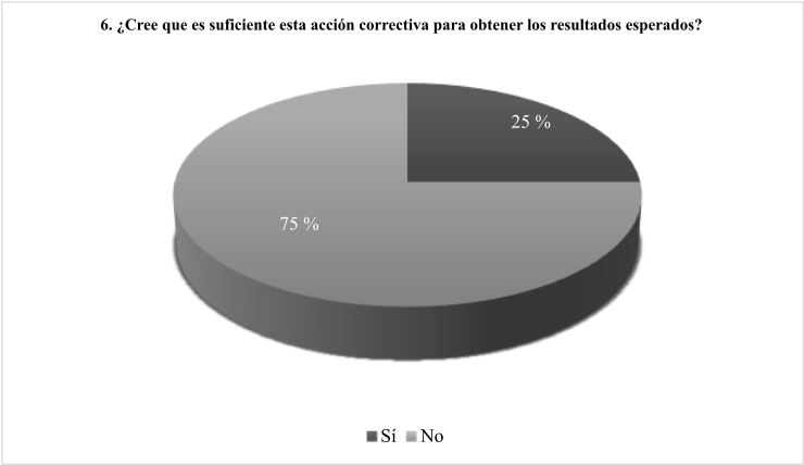 El 75 % de los encuestados indica que no es suficiente la acción correctiva para obtener los resultados esperados y el 25 % restante dice que sí es suficiente. En el caso de las respuestas afirmativas, se planteó evaluar el cumplimiento del proyecto en los siguientes aspectos: