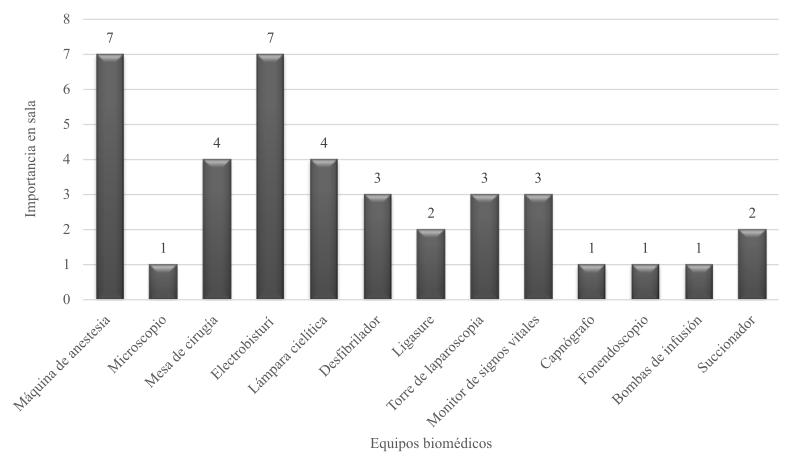 Se implementó y se validó la metodología gerencial diseñada con el personal experto en el área, tanto de salud como de gestión de mantenimiento, por medio de entrevistas a 10 expertos de cada área que pertenecían a diferentes instituciones de salud con cirugías ambulatorias habilitadas. Los equipos requeridos en una sala ambulatoria según los puntajes más altos arrojados por las entrevistas fueron: máquina de anestesia, mesa de cirugía, electrobisturí y lámpara cielítica (figura 2).