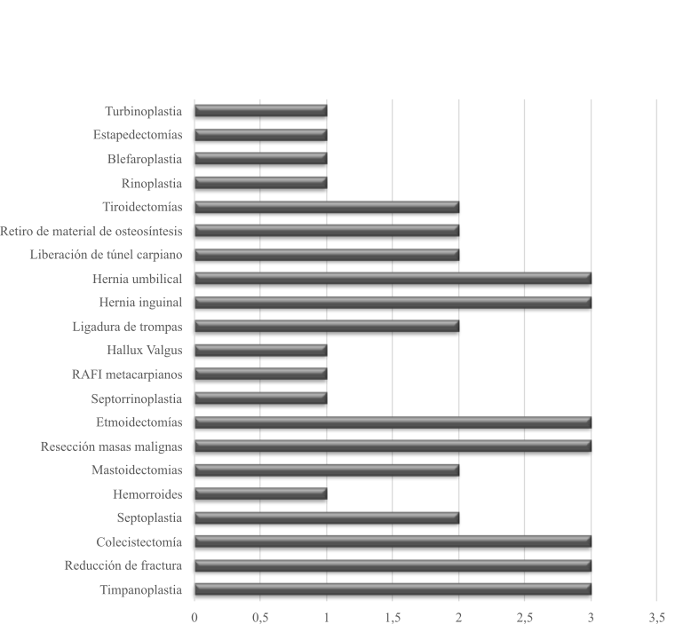 De igual manera, se enumeraron las cirugías más frecuentes en los quirófanos al momento de implementar la metodología. Se evidenció que, según el personal experto, las cirugías más comunes fueron: hernia umbilical e inguinal, etmoidectomías, resección de masas malignas, colecistectomía, reducción de fracturas y timpanoplastias (figura 3).