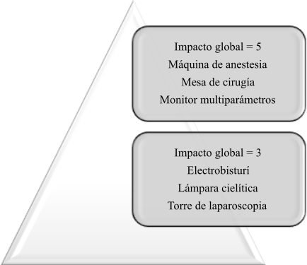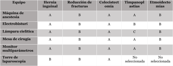 Posteriormente, al tener definidos los equipos médicos y las cirugías más frecuentes en una sala ambulatoria fue posible identificar el impacto operacional de cada equipo disponible en la unidad según la clasificación ya establecida (tabla 5).