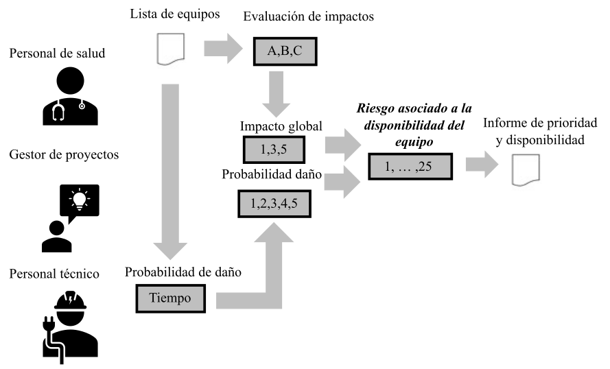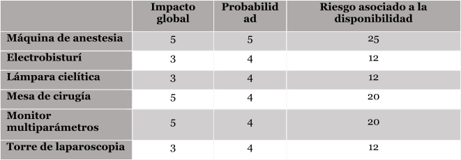 El nivel de riesgo asociado a la disponibilidad contempla de forma simultánea el impacto global del equipo y la probabilidad de daño. Los equipos con mayor impacto y probabilidad de daño deberán tener mayor prioridad. Esto significa que si es muy probable que un equipo se dañe si no se realiza el mantenimiento preventivo y este es indispensable en la unidad de cirugía ambulatoria, tendrá el primer lugar para que se le realice mantenimiento para garantizar su disponibilidad.