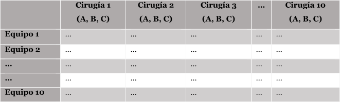 La matriz se diligencia con la información reportada por el equipo médico y auxiliar de la unidad de cirugía ambulatoria. Para cada pareja equipo-cirugía se asigna una de las opciones A, B o C.
