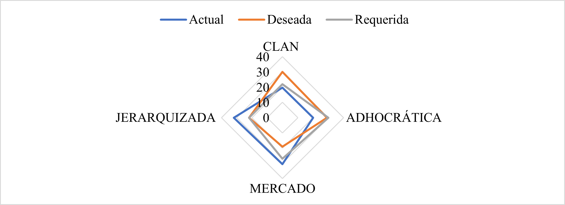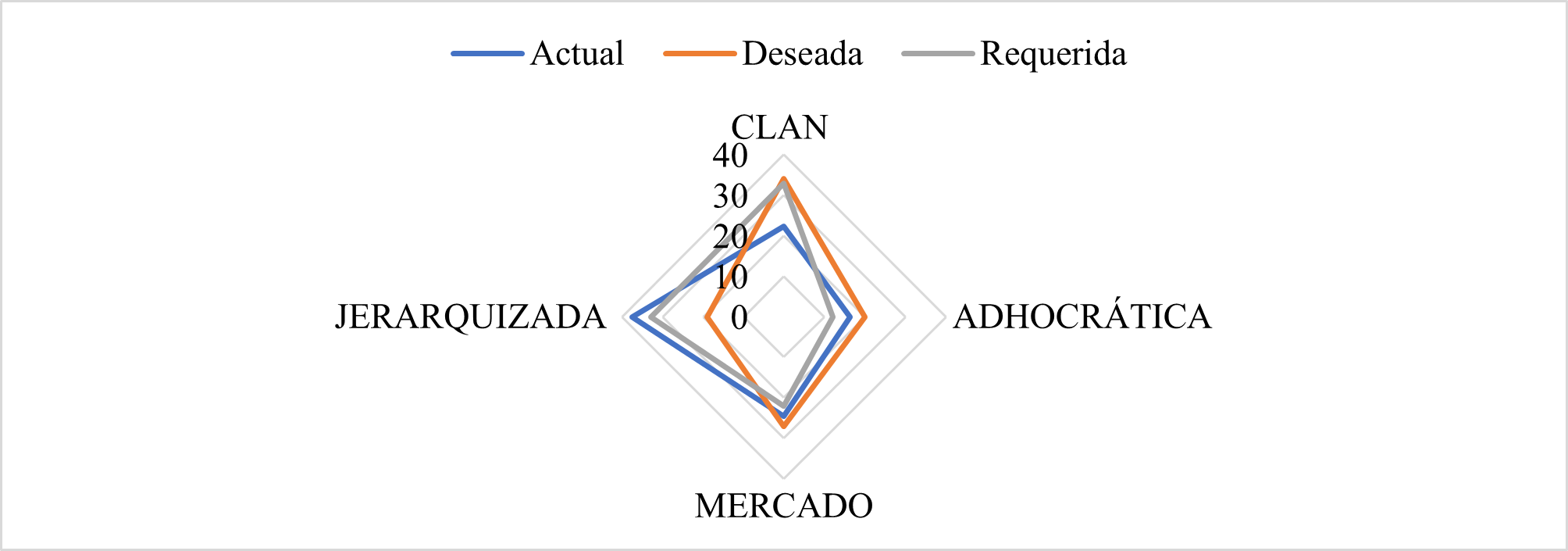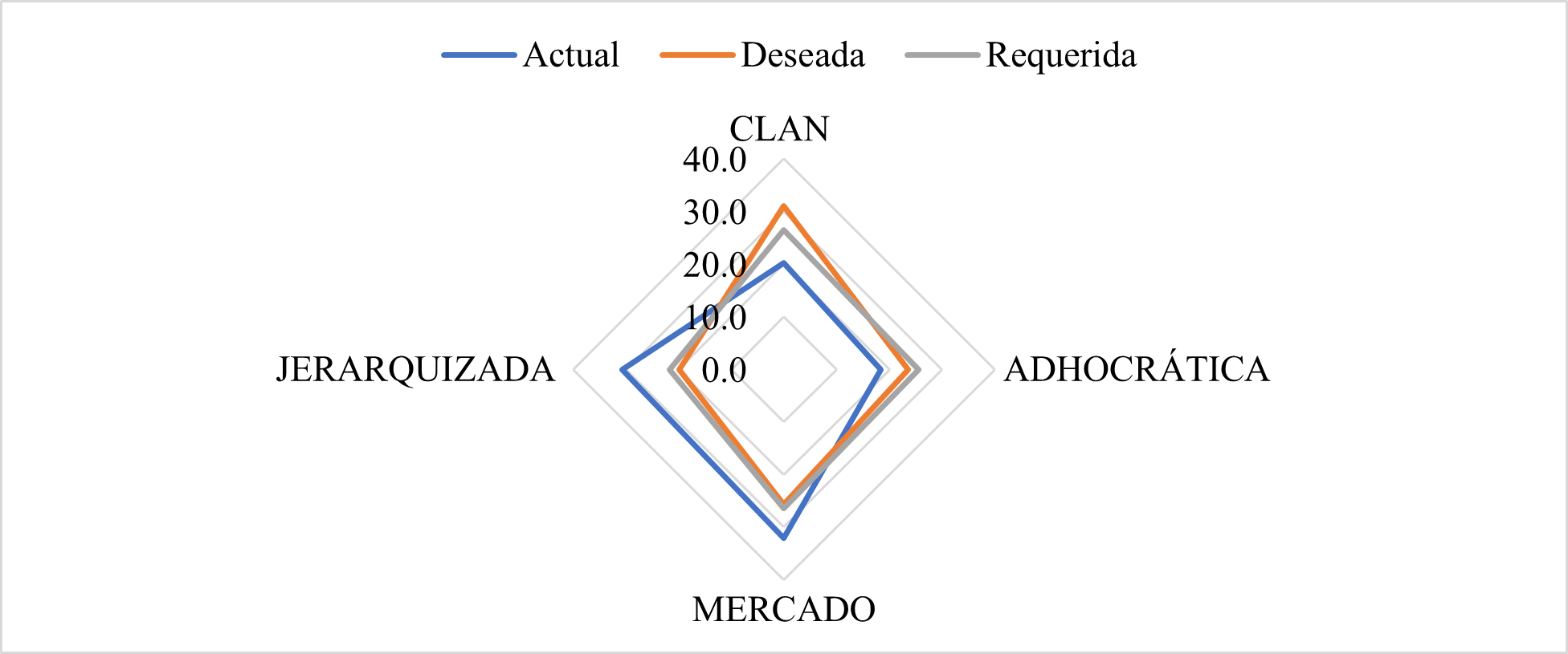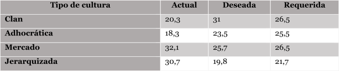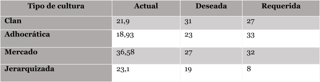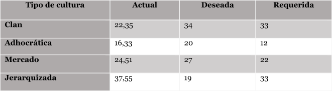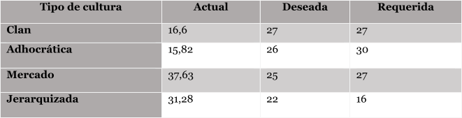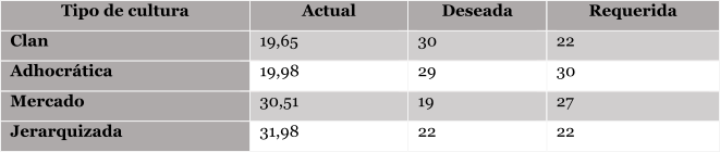 La identificación de brechas comienza con el análisis general de los datos obtenidos en los talleres realizados para identificar la cultura deseada y la requerida con colaboradores de la entidad expertos en la implementación y mejora de sistemas de gestión (tabla 1). En la figura 2 se ilustran las tres culturas que se identificaron con el cuestionario de Cameron y Quinn.