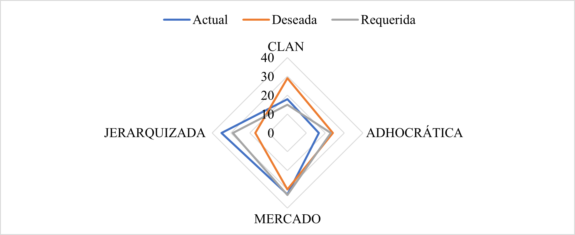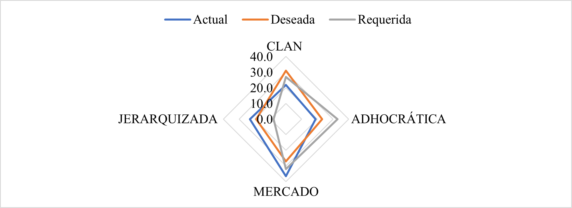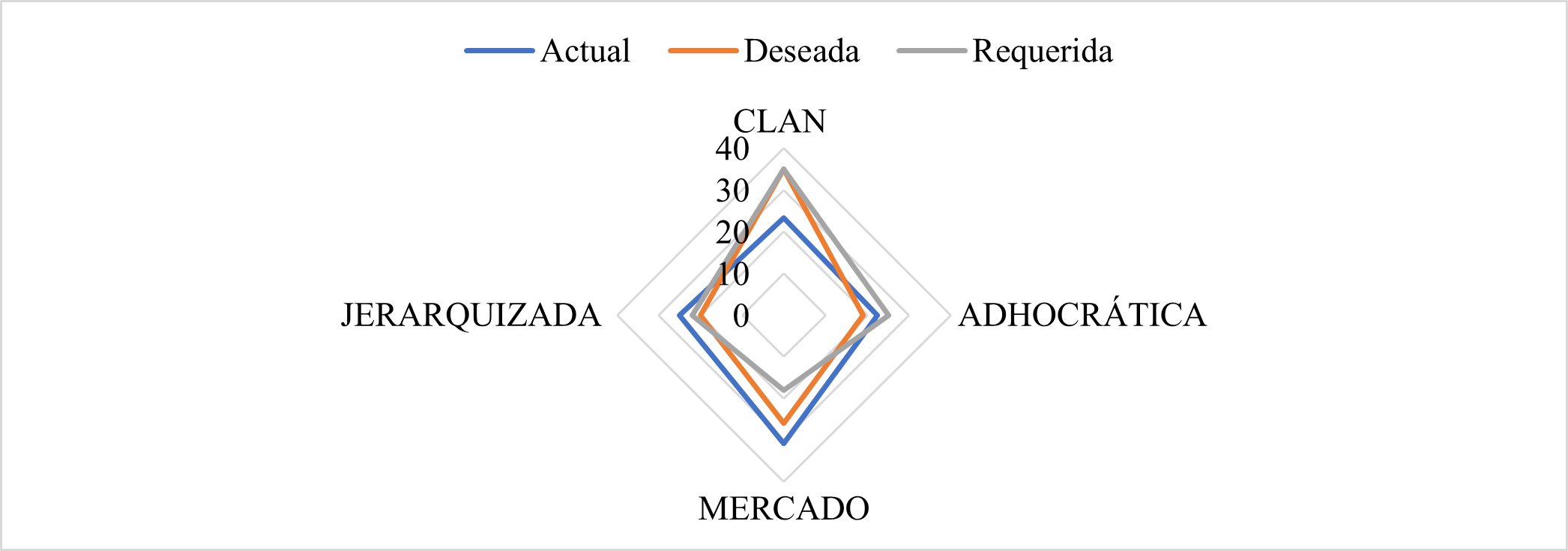 La identificación de brechas comienza con el análisis general de los datos obtenidos en los talleres realizados para identificar la cultura deseada y la requerida con colaboradores de la entidad expertos en la implementación y mejora de sistemas de gestión (tabla 1). En la figura 2 se ilustran las tres culturas que se identificaron con el cuestionario de Cameron y Quinn.