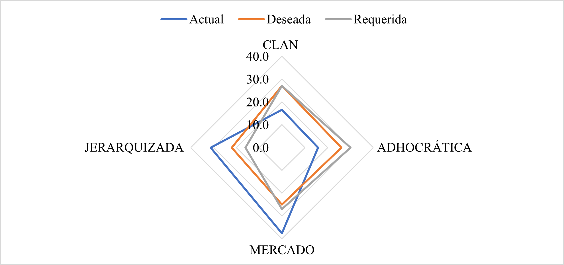 En la figura 2 se muestran las tres culturas de la ANH (actual, deseada y requerida) y se observa que la cultura actual es mercado, la cultura deseada es clan y la cultura requerida presenta un empate entre clan y mercado. La cultura clan, que corresponde a la identificada como deseada y requerida por la ANH, es uno de los tipos de cultura que, según la literatura, favorece la implementación y mejora de los sistemas de gestión. Por lo tanto, se deben establecer estrategias para adoptar rasgos característicos de este tipo de cultura.