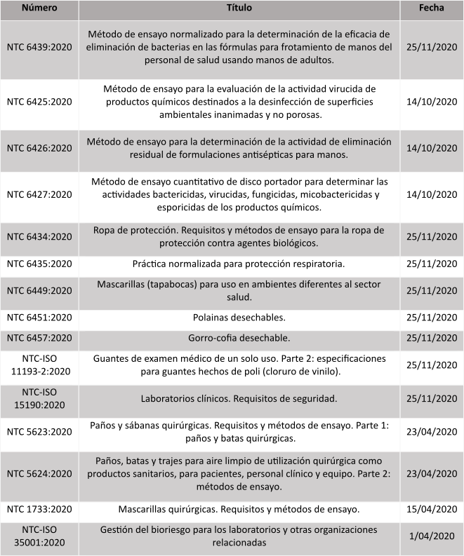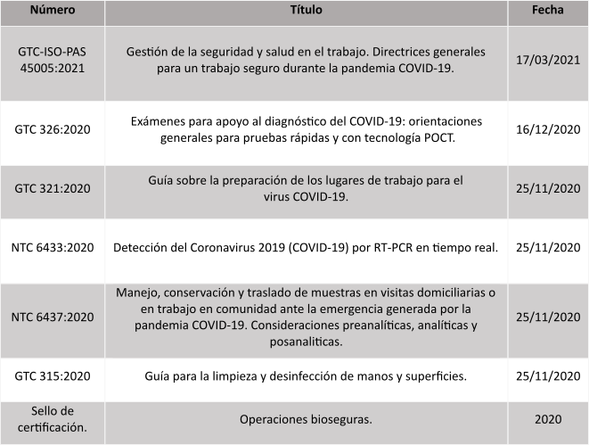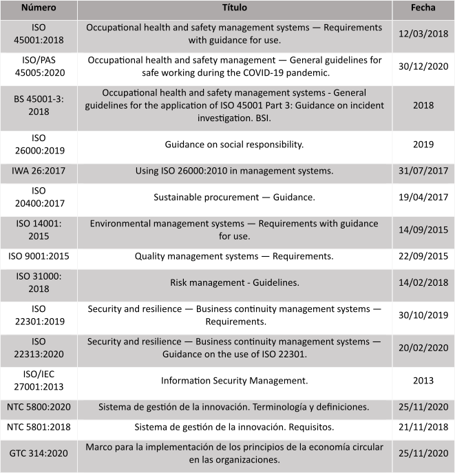 Específicamente para el abordaje de las condiciones de trabajo y de los efectos que he generado la pandemia, en los colaboradores se cuenta con normas como la ISO 45001: 20018 (ICONTEC, 2018), la ISO/PAS 45005:2020 (ISO, 2020) y la BSI 45001-3 para la investigación de incidentes (BSI, 2018). Las dos primeras fueron adoptadas por el país con los nombres de Norma técnica colombiana y Guía técnica colombiana respectivamente (ver tabla 2) y la tercera corresponde a una guía que orienta los procesos y procedimientos de investigación de incidentes y accidentes establecidos en la legislación colombiana (Resolución 1401, 2007; Decreto 1072, 2015; Resolución 0312, 2019) y las directrices relativas a los sistemas de gestión se seguridad y salud en el trabajo (Organización Internacional del Trabajo, 2001). Además, en el 2020, Colombia creó 15 normas técnicas asociadas a temas de bioseguridad, las cuales pueden aportar en el control y mitigación de la COVID-19.
