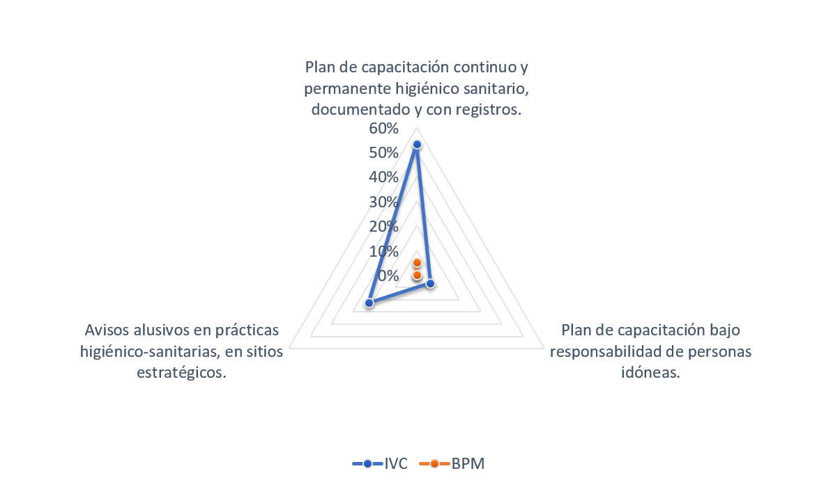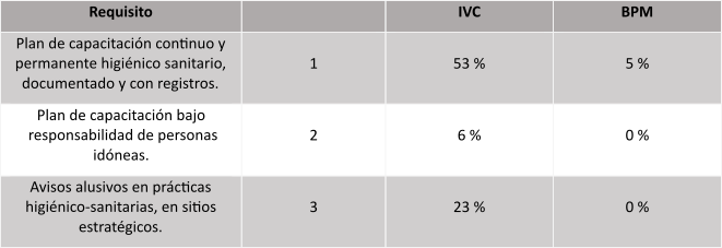 Con respecto al tema de capacitación y educación sanitaria, la mayor incidencia se observa igualmente asociada a un plan de capacitación, debidamente documentado y sus registros. Aquí se evidencia un importante avance en el tema para las plantas ya certificadas en BPM con un menor indicador.